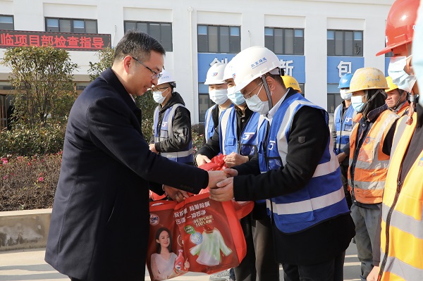 1月16日下午,温州高新区(经开区)党工委委员、工会工委主任赵立强等区工会领导来到滨海核心区市政基础工程施工现场,看望慰问工程一线工作人员,送上春节慰问品和新年祝福,并对施工现场进行了检查和指导。瓯飞集团董事长倪士章,党委委员、工会主席章妙妙,龙达公司等相关领导陪同慰问。