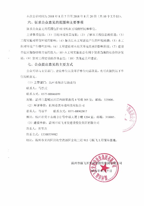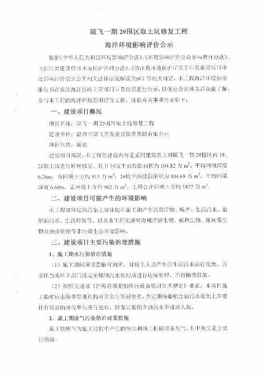 瓯飞一期2#围区取土坑修复工程海洋环境影响评价公示