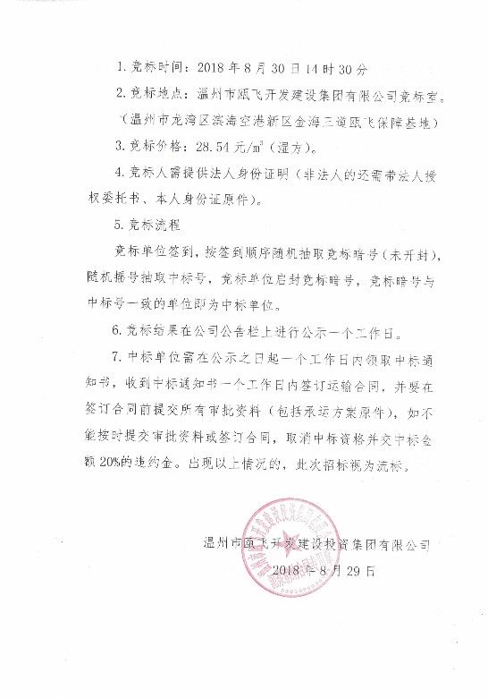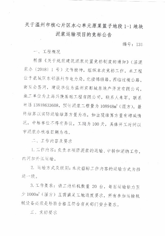 关于温州市核心片区水心单元原菜篮子地段1-1地块泥浆运输的竞标公告