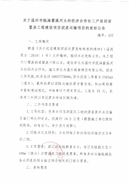 关于温州市瓯海瞿溪河头村经济合作社三产返回安置房工程建设项目泥浆运输项目的竞标公告