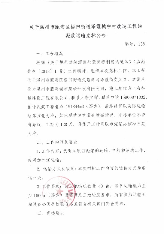 关于温州市瓯海区梧田街道泽霞城中村改造工程的泥浆运输竞标公告