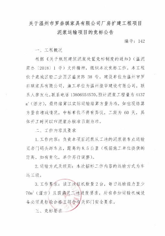 关于温州市罗奈琪家具有限公司厂房扩建工程项目泥浆运输的竞标公告