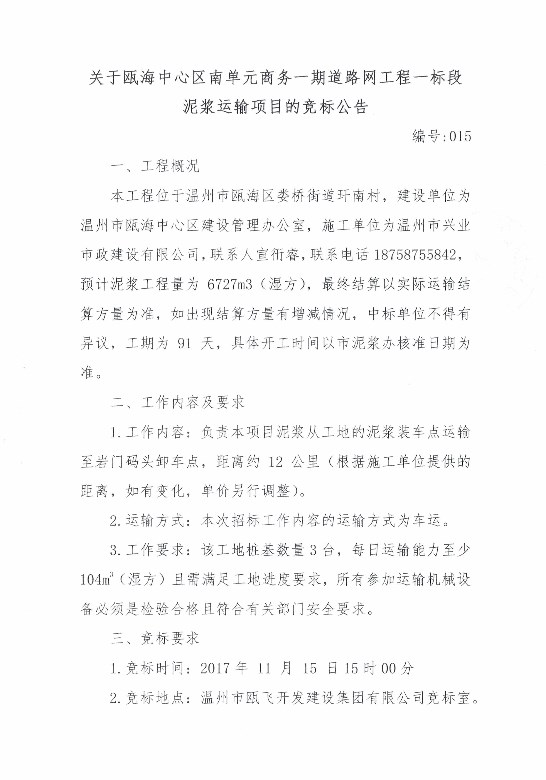 关于瓯海中心区南单元商务一期道路网工程一标段泥浆运输项目的竞标公告