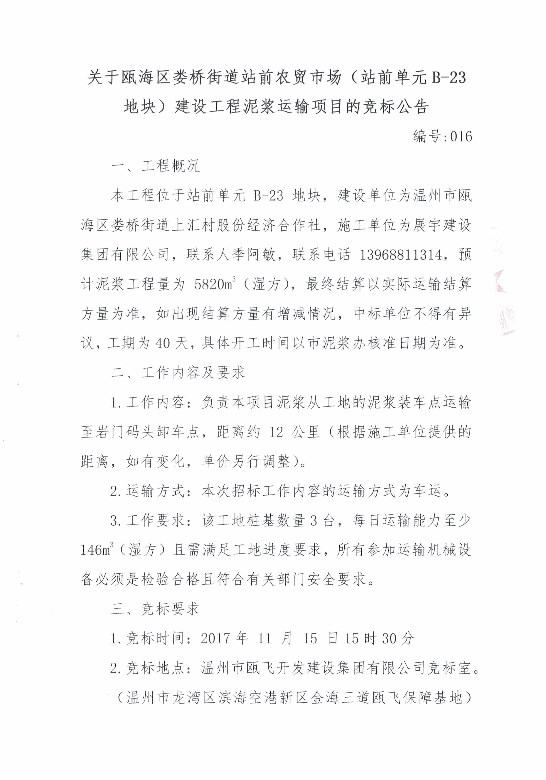 关于瓯海区娄桥街道站前农贸市场(站前单元B-23地块)建设工程泥浆运输项目的竞标公告