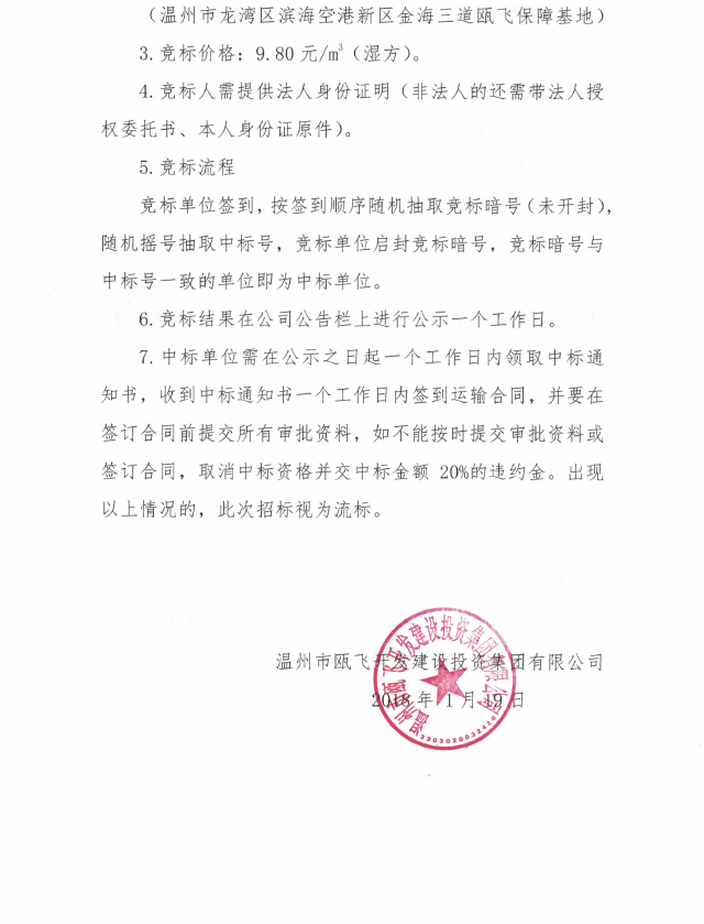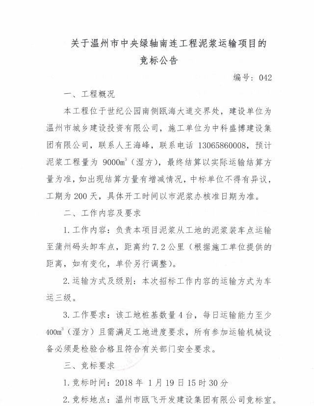 关于温州市中央绿轴南连工程泥浆运输项目的竞标公告