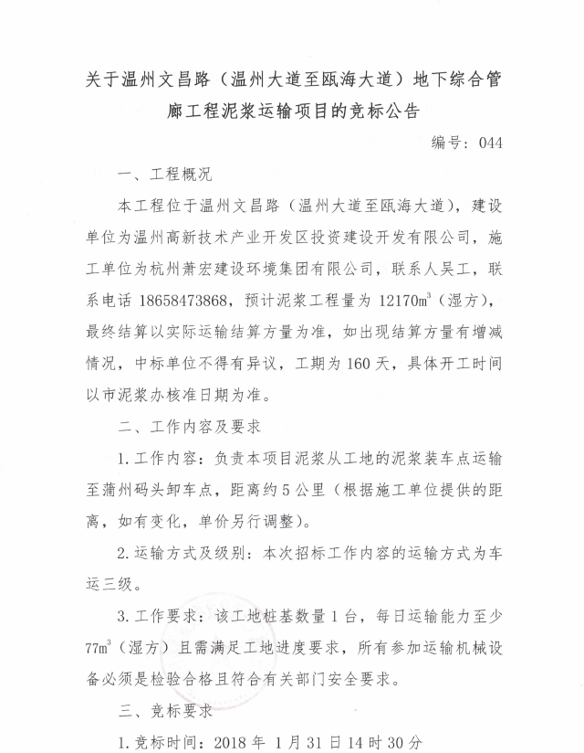 关于温州文昌路(温州大道至瓯海大道)地下综合管廊工程泥浆运输项目的竞标公告