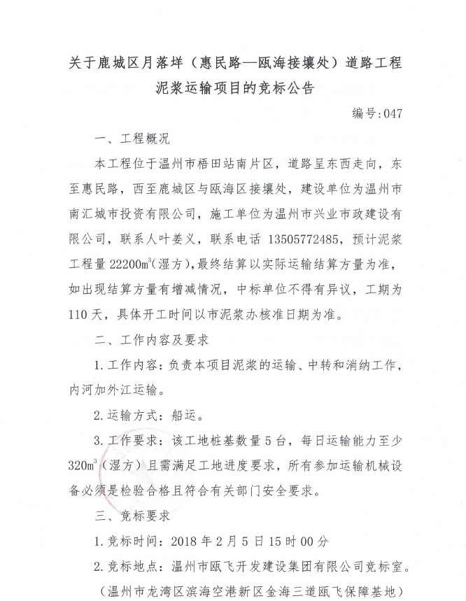 关于鹿城区月落垟(惠民路—瓯海接壤处)道路工程泥浆运输项目的竞标公告