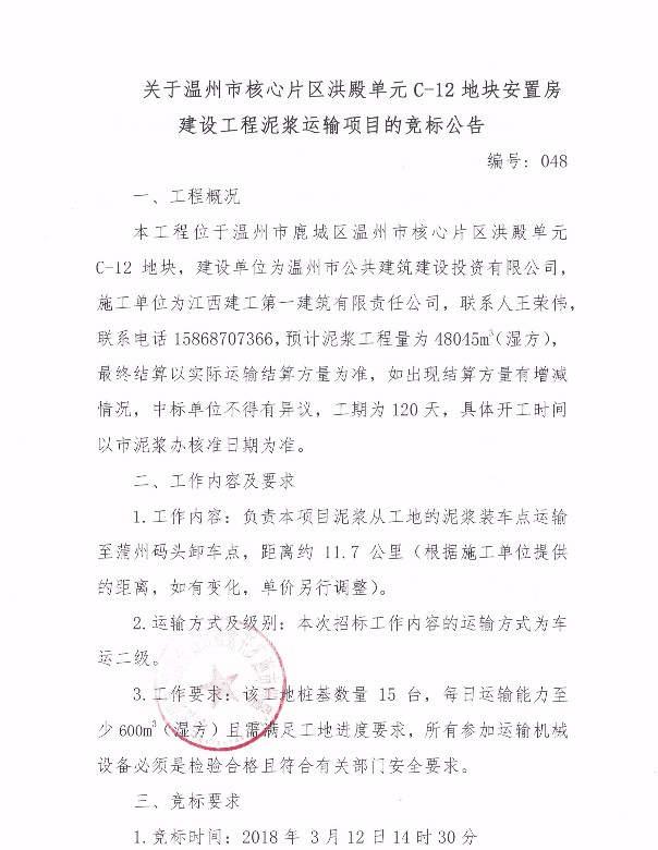 关于温州市核心片区洪殿单元C-12地块安置房建设工程泥浆运输项目的竞标公告