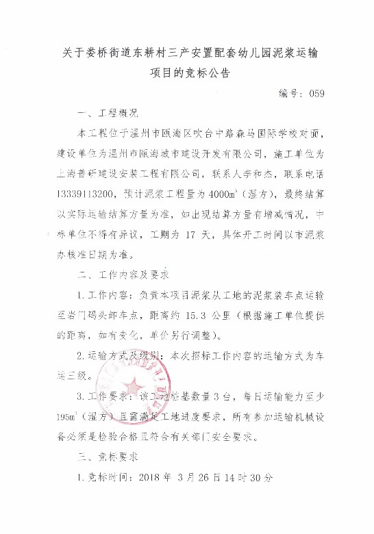 关于娄桥街道东耕村三产安置配套幼儿园泥浆运输项目的竞标公告
