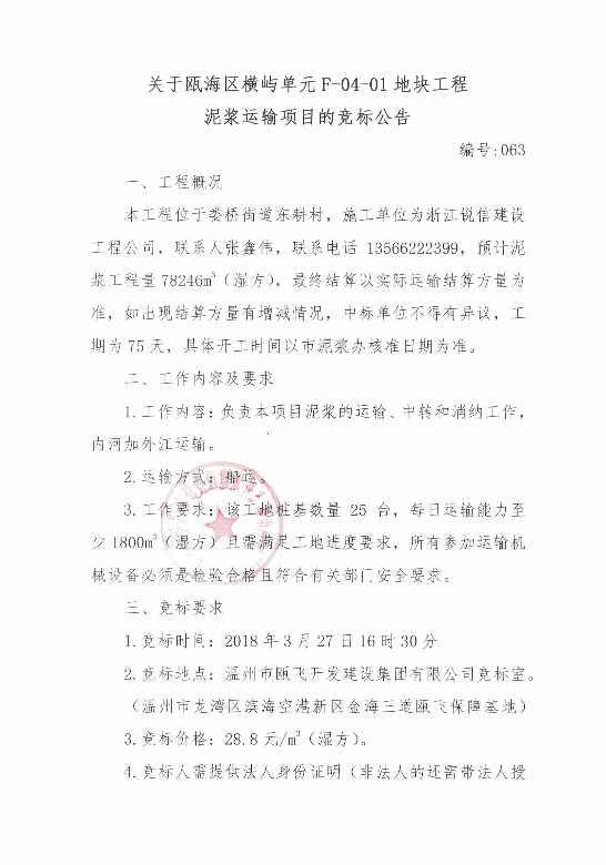 关于瓯海区横屿单元F-04-01地块工程泥浆运输项目的竞标公告