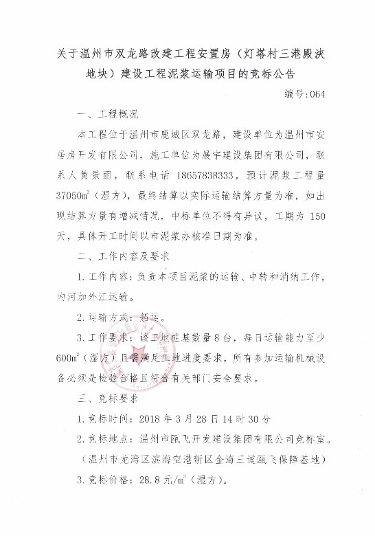 关于温州市双龙路改建工程安置房(灯塔村三港殿浃地块)建设工程泥浆运输项目的竞标公告