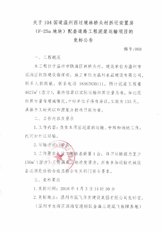 关于104国道温州西过境林桥头村拆迁安置房(F-25a地块)配套道路工程泥浆运输项目的竞标公告