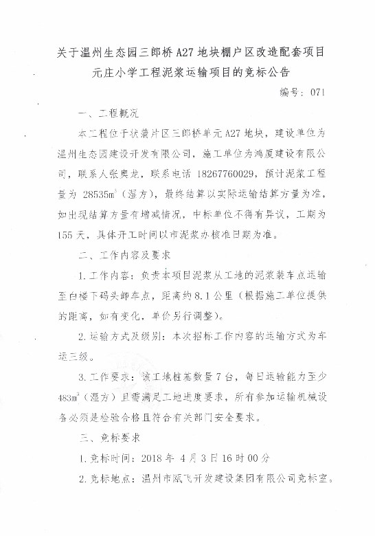 关于温州生态园三郎桥A27地块棚户区改造配套项目元庄小学工程泥浆运输项目的竞标公告