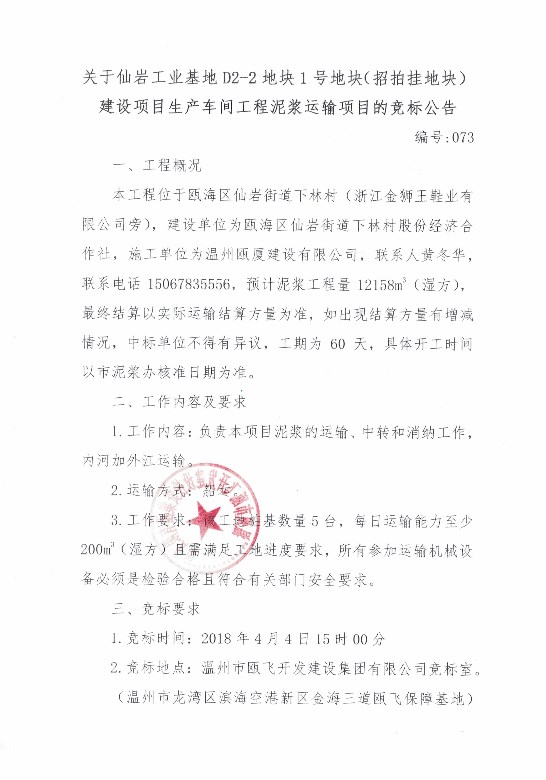 关于仙岩工业基地D2-2地块1号地块(招拍挂地块)建设项目生产车间工程泥浆运输项目的竞标公告