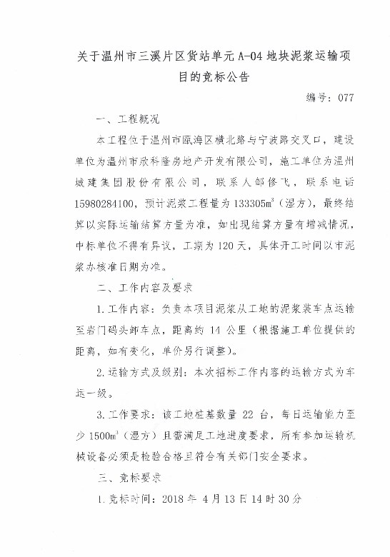 关于温州市三溪片区货站单元A-04地块泥浆运输项目的竞标公告