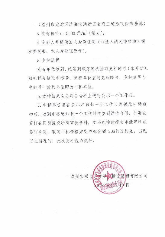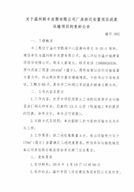 关于温州联丰皮塑有限公司厂房拆迁安置项目泥浆运输项目的竞标公告