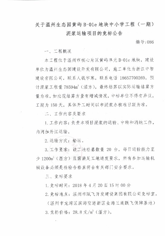 关于温州生态园黄屿B-01e地块中小学工程(一期)泥浆运输项目的竞标公告