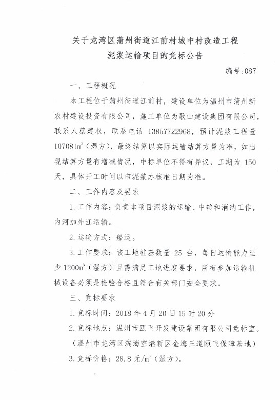 关于龙湾区蒲州街道江前村城中村改造工程泥浆运输项目的竞标公告