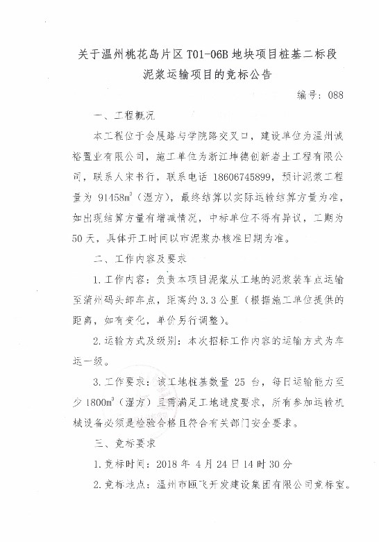 关于温州桃花岛片区T01-06B地块项目桩基二标段泥浆运输项目的竞标公告