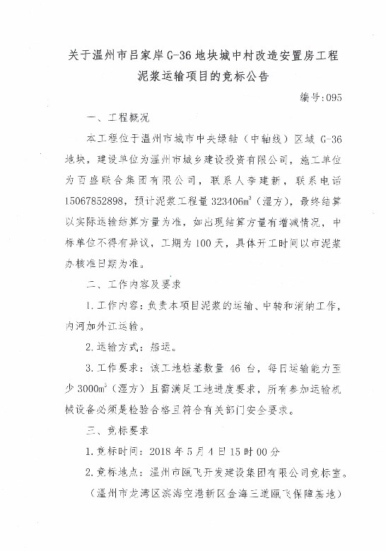 关于温州市吕家岸G-36地块城中村改造安置房工程泥浆运输项目的竞标公告