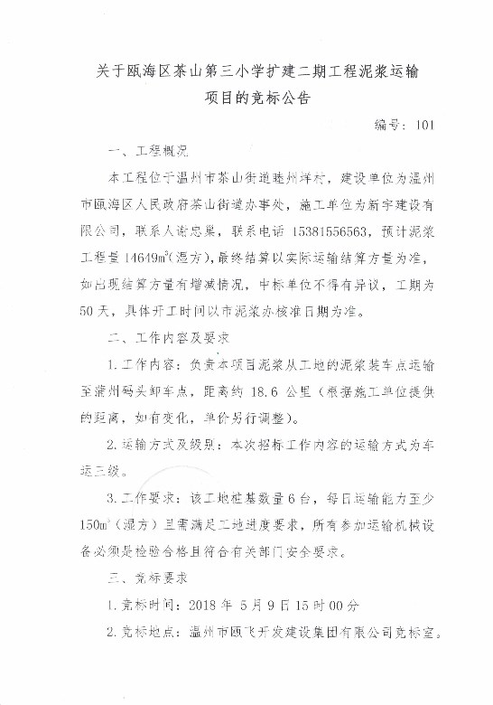 关于瓯海区茶山第三小学扩建二期工程泥浆运输项目的竞标公告