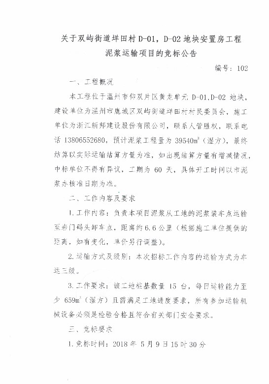 关于双屿街道垟田村D-01,D-02地块安置房工程泥浆运输项目的竞标公告
