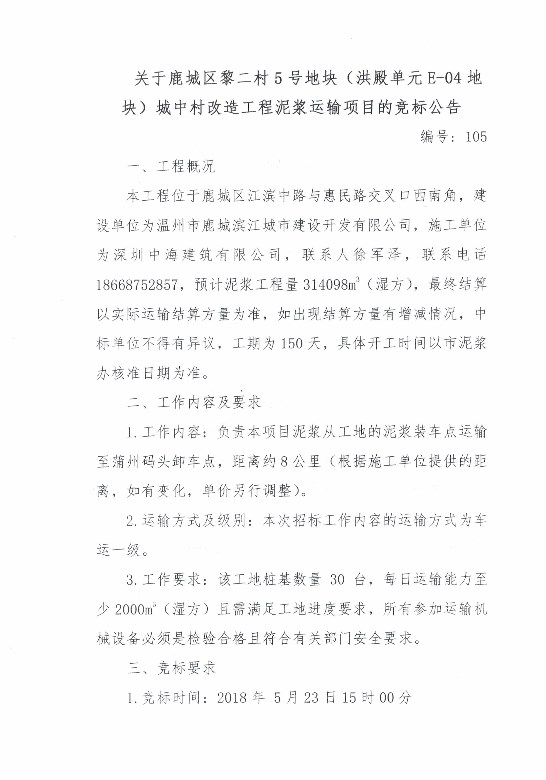 关于鹿城区黎二村5号地块(洪殿单元E-04地块)城中村改造工程泥浆运输项目的竞标公告