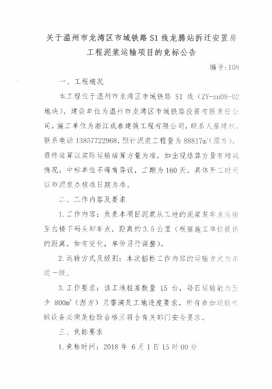关于温州市龙湾区市域铁路S1线龙腾站拆迁安置房工程泥浆运输项目的竞标公告