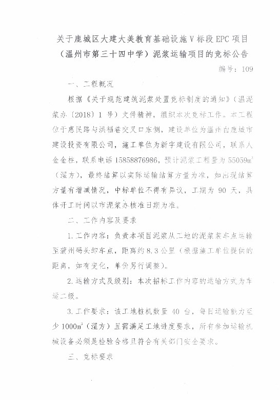 关于鹿城区大建大美教育基础设施V标段EPC项目(温州市第三十四中学)泥浆运输项目的竞标公告