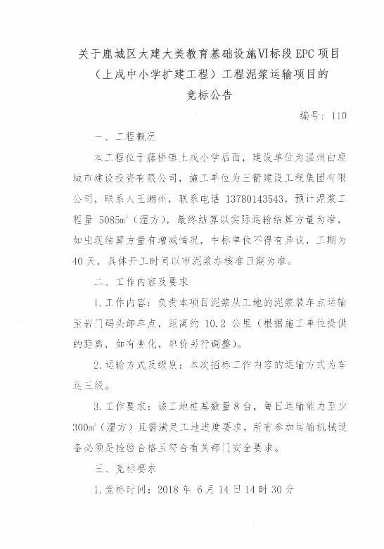 关于鹿城区大建大美教育基础设施V标段EPC项目(温州市第三十四中学)泥浆运输项目的竞标公告