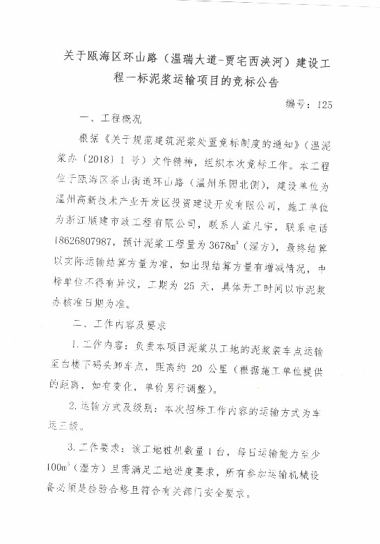 关于瓯海区环山路(温瑞大道-贾宅西浃河)建设工程一标泥浆运输项目的竞标公告