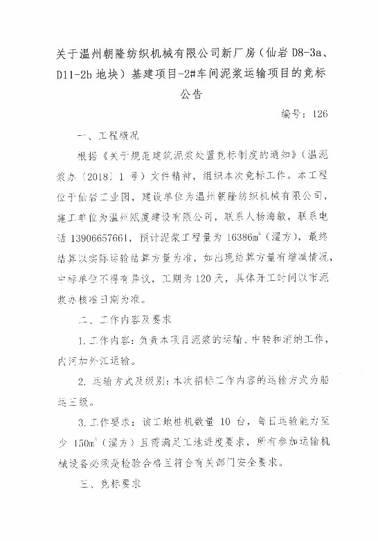 关于温州朝隆纺织机械有限公司新厂房(仙岩D8-3a、D11-2b地块)基建项目-2#车间泥浆运输项目的竞标公告
