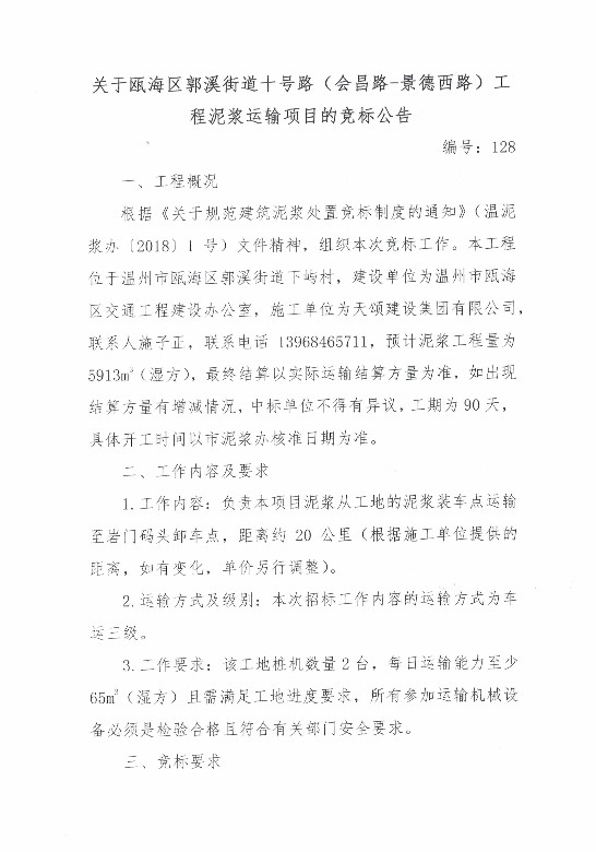 关于瓯海区郭溪街道十字路(会昌路-景德西路)工程泥浆运输项目的竞标公告