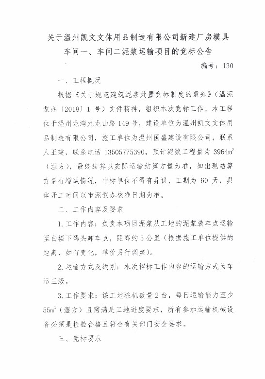 关于温州凯文文体用品制造有限公司新建厂房模具车间一、车间二泥浆运输项目的竞标公告