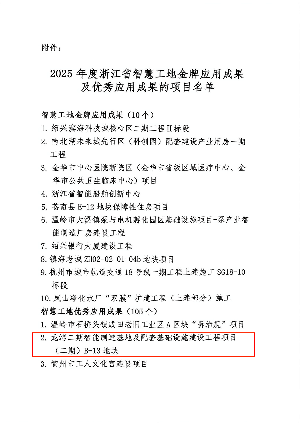 近日,浙江省建筑业行业协会公布2025年度浙江省智慧工地优秀应用成果名单,龙湾区重点产业项目——龙湾二期智能制造基地及配套基础设施建设工程(二期)B-13地块成功入选,成为龙湾区此次获评该奖项的两个项目之一。