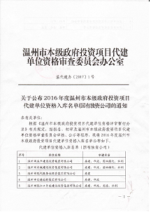 近日,温州市发展和改革委员会公布了2016年度温州市本级政府投资项目代建单位资格拟入库名单(国有独资公司),集团公司名列其中。